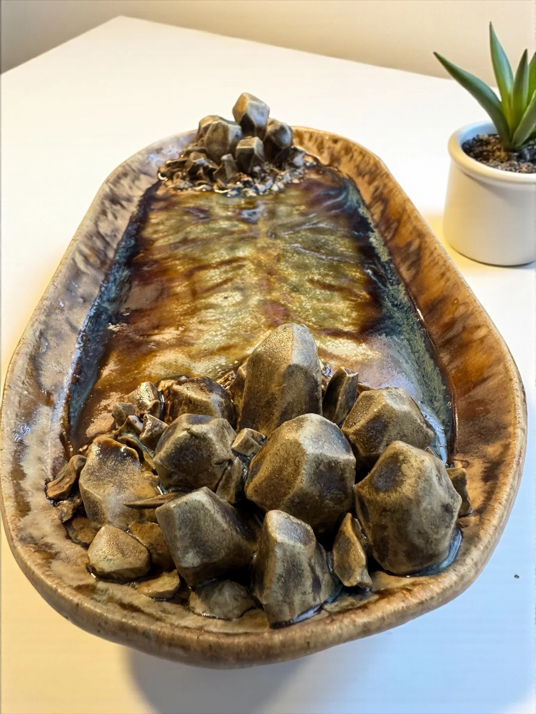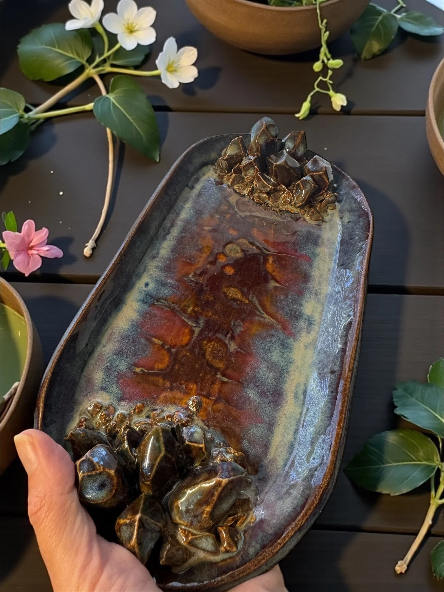Each crystal was individually shaped and arranged by hand, making this piece truly one of a kind. The combination of glaze movement and sculptural texture evokes a sense of calm, grounding, and wonder — perfect for display on an altar, bookshelf, or as a statement piece in your home.