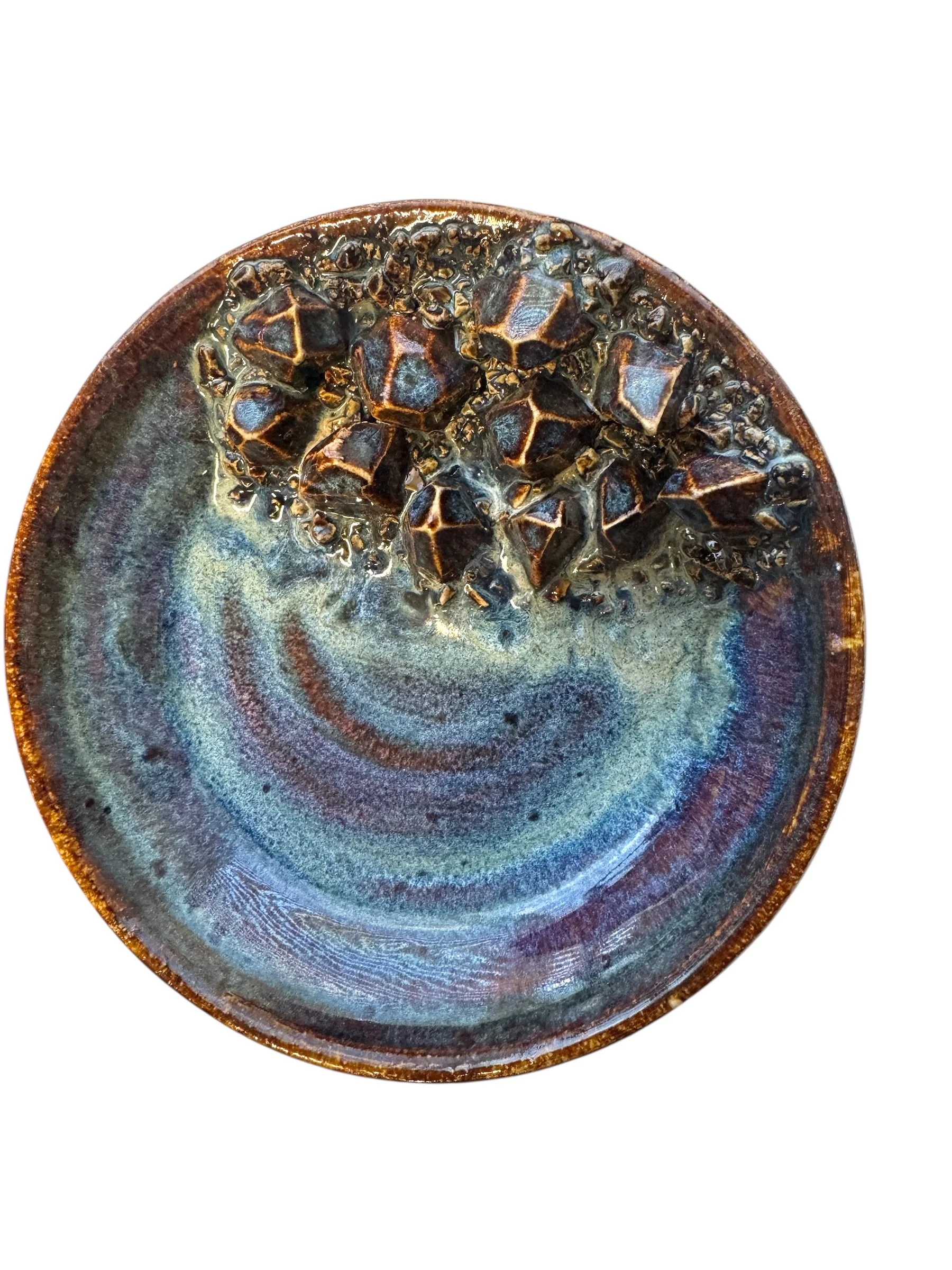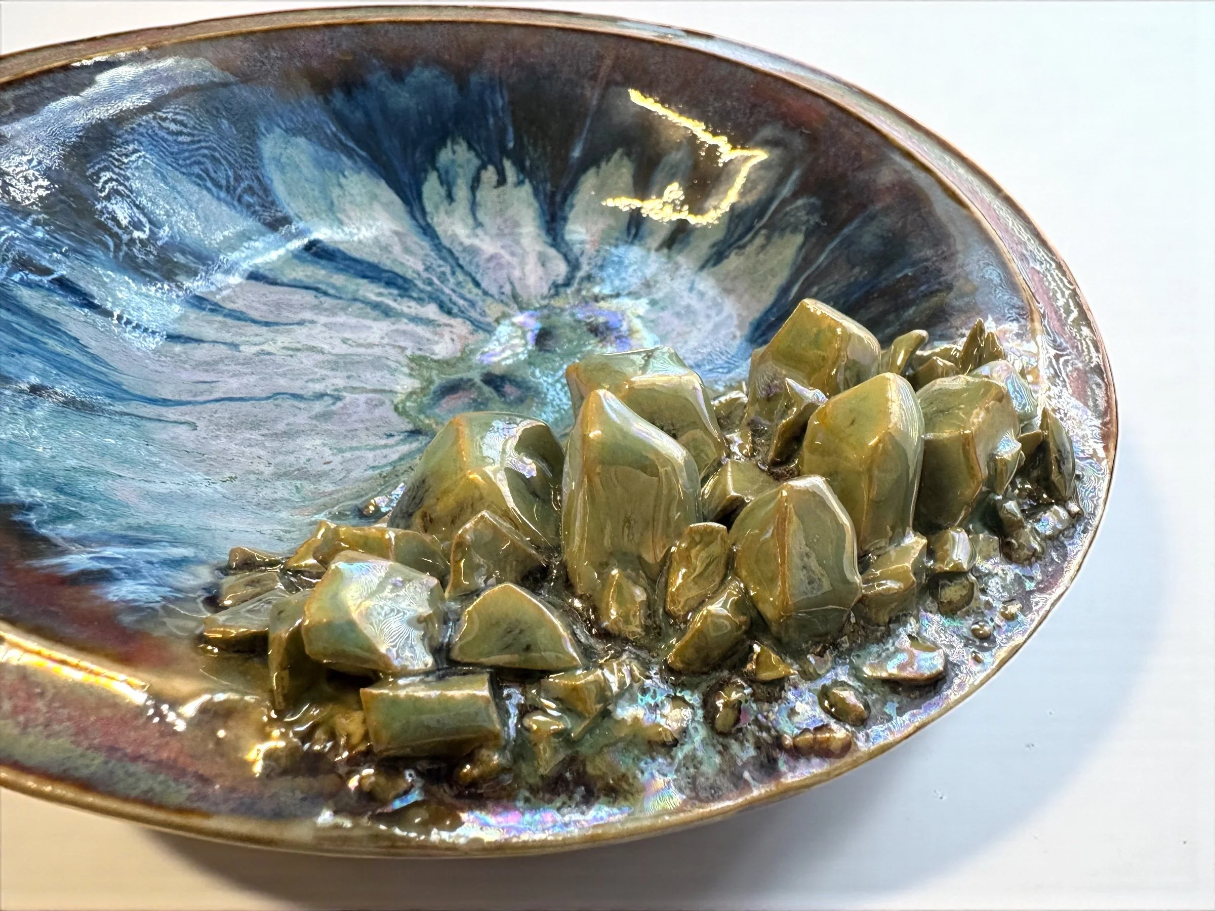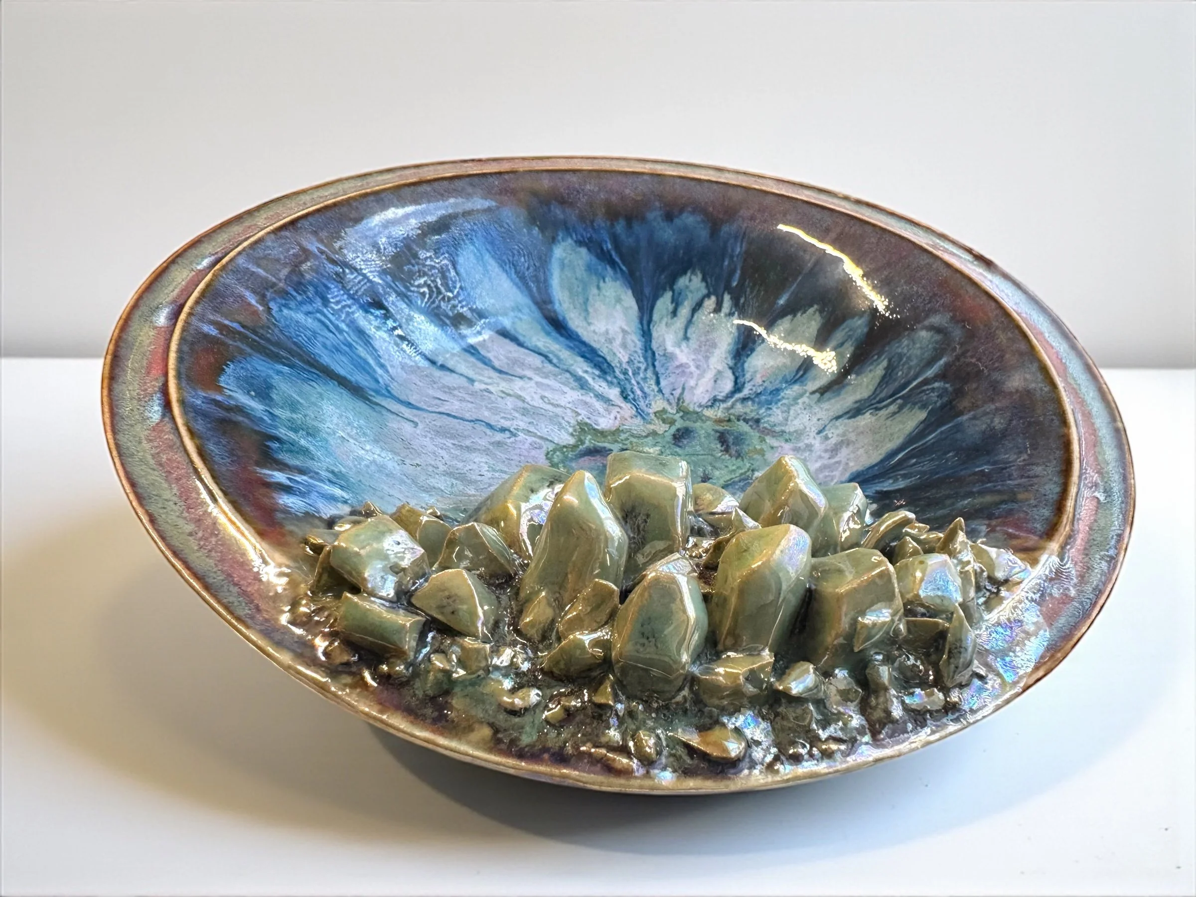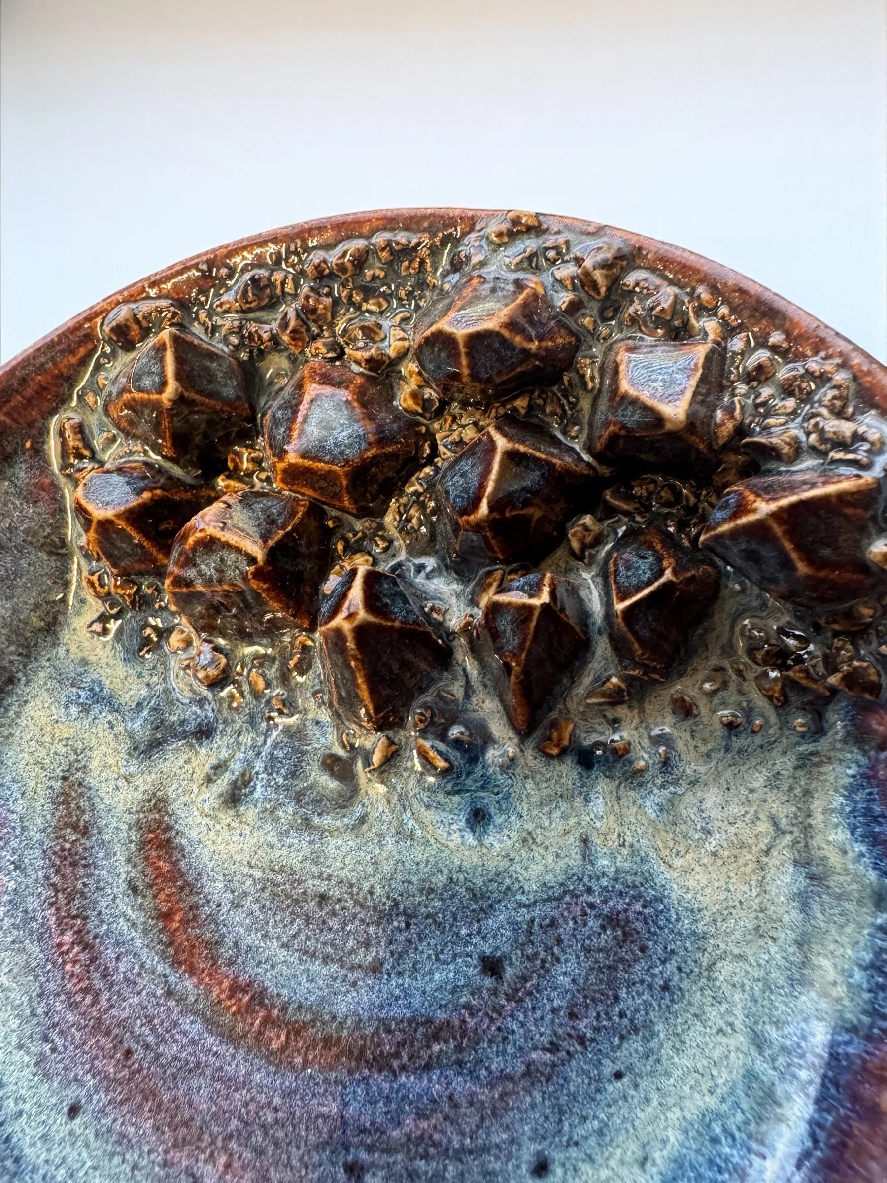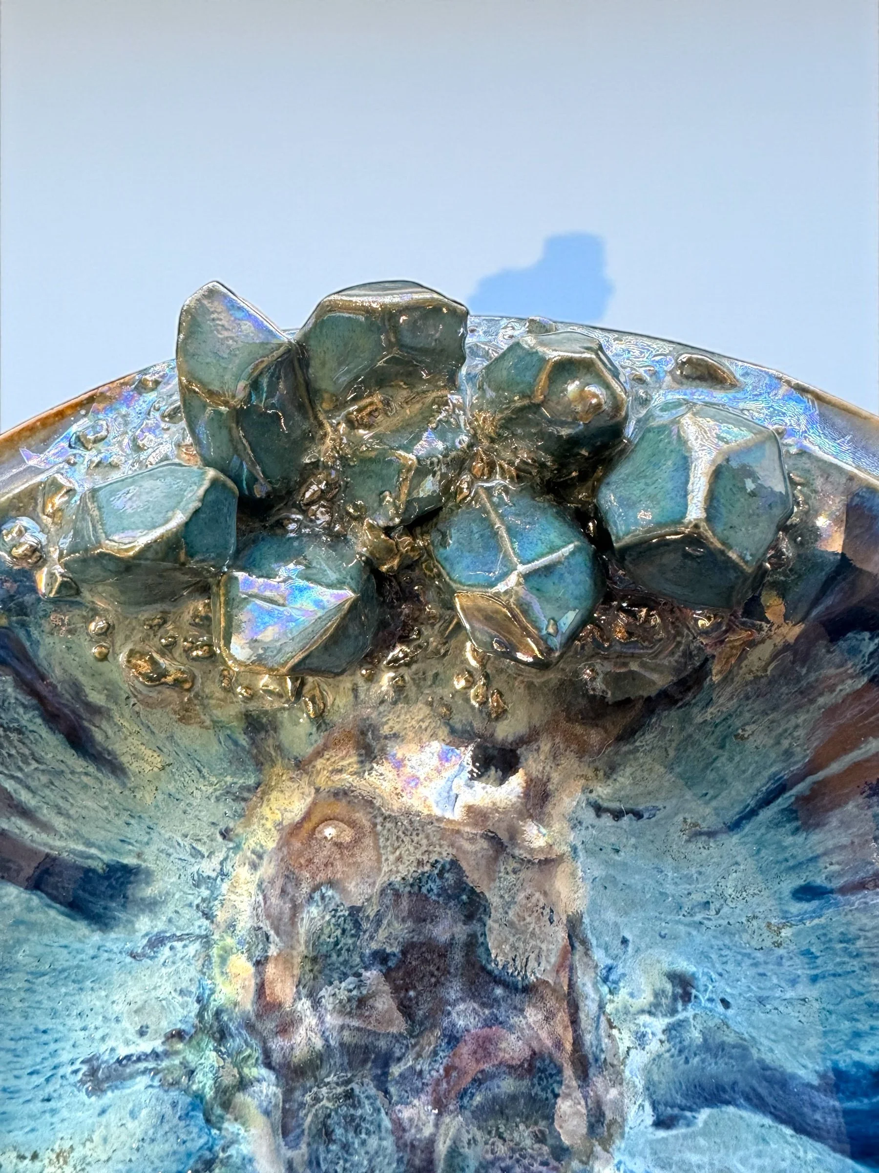 Every crystal was shaped and positioned by hand, creating organic textures that reflect the natural beauty of mineral growth. The glaze reveals a spectrum of shifting colors, giving the piece a rich depth that changes in different light.