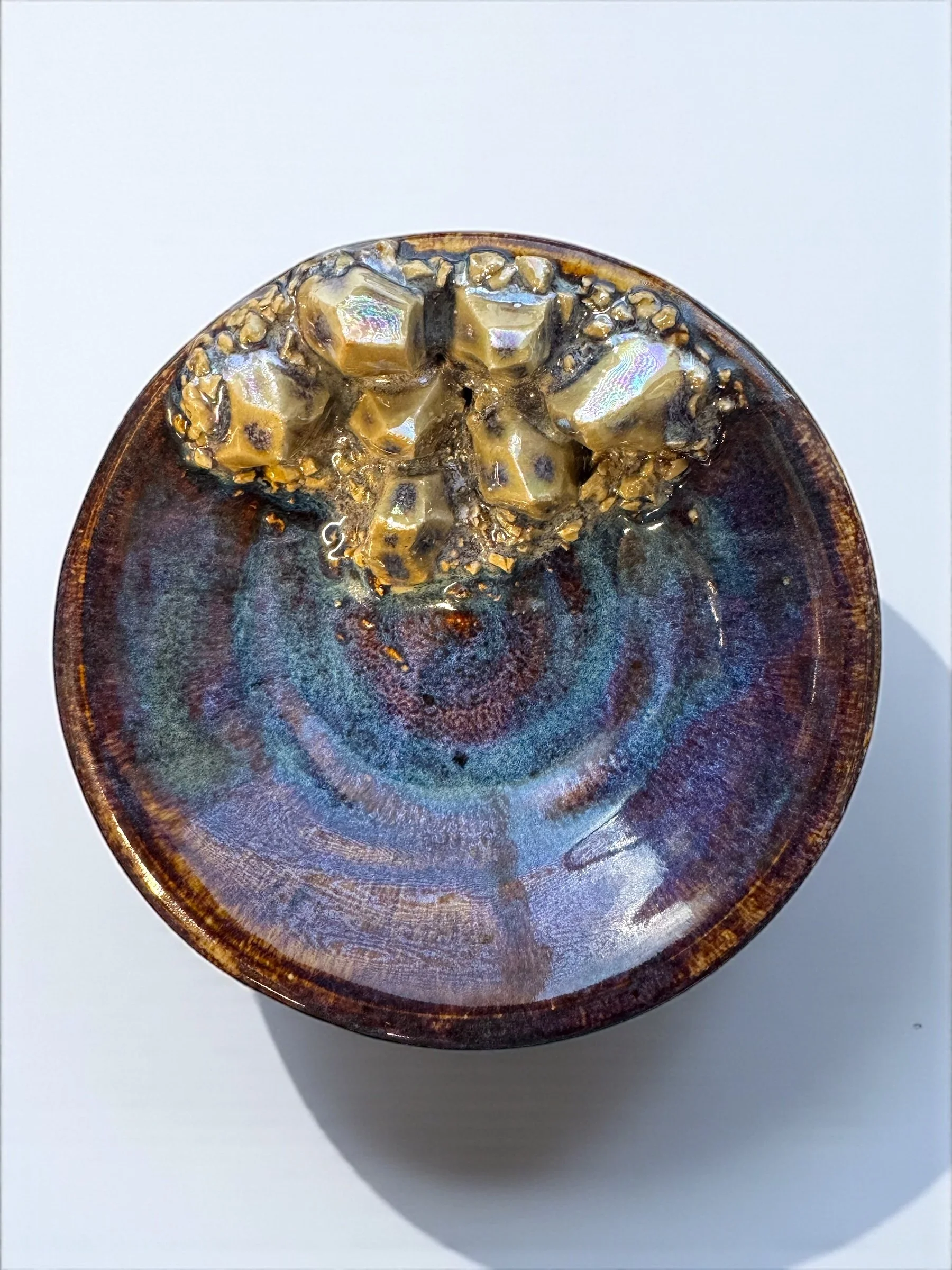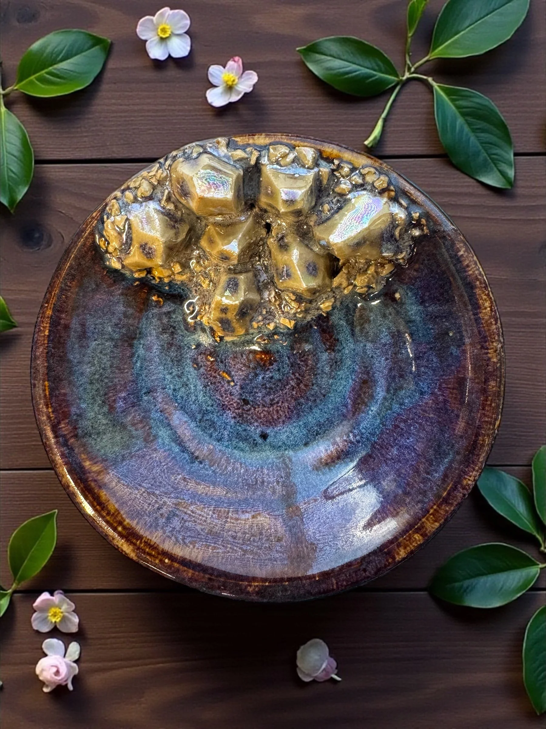 This handmade ceramic bowl captures the balance between earth and energy — a flowing river of molten glaze framed by two clusters of hand-sculpted crystals. Rich tones of bronze, gold, and violet ripple through the surface like sunlight dancing on a mineral spring.