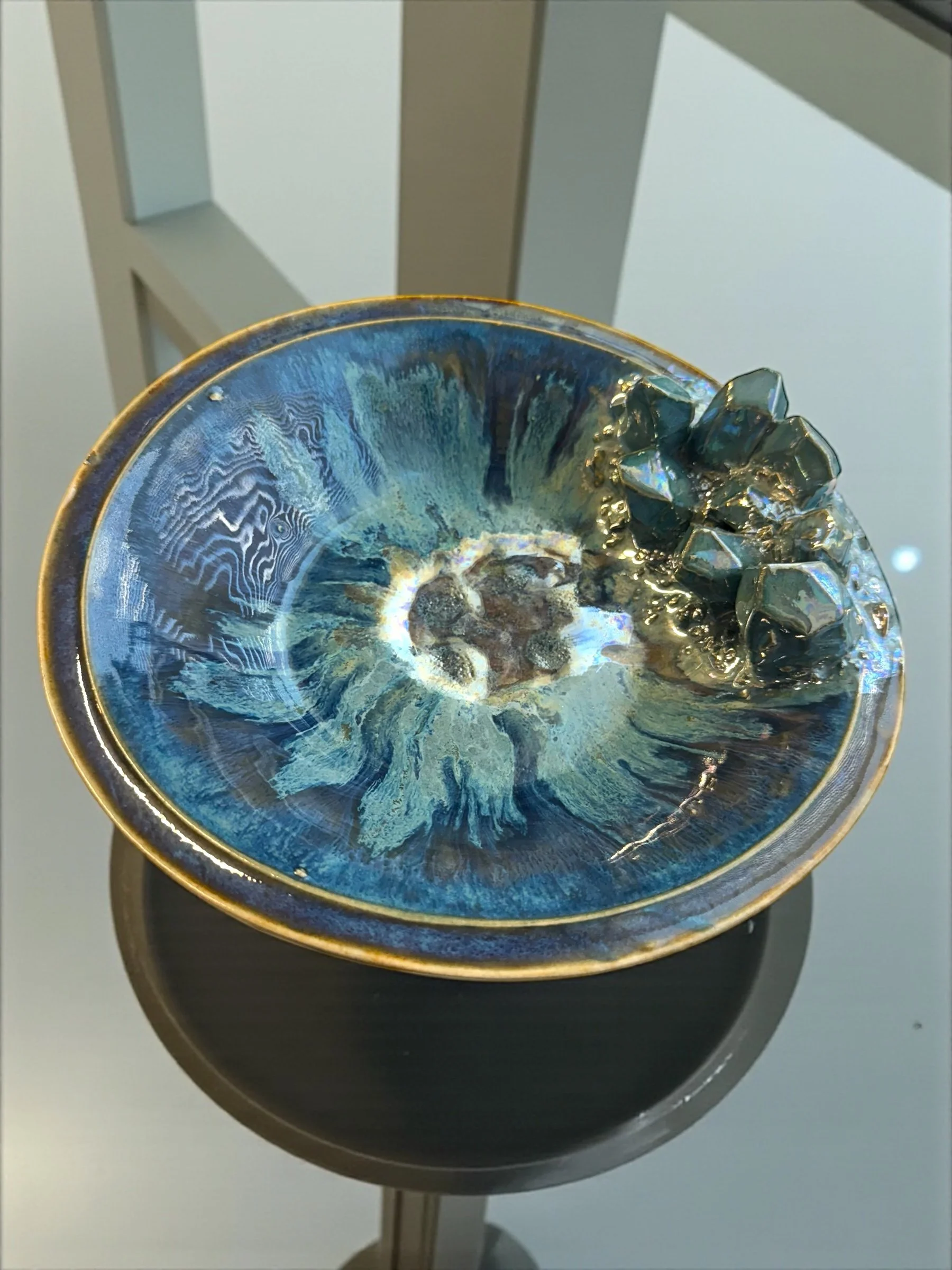 A cluster of hand-sculpted crystals rises from the edge, glimmering with soft iridescence. Each crystal was individually shaped and placed by hand, creating a stunning contrast between smooth glaze and natural texture. The piece radiates harmony and depth — a perfect balance between water and earth elements.