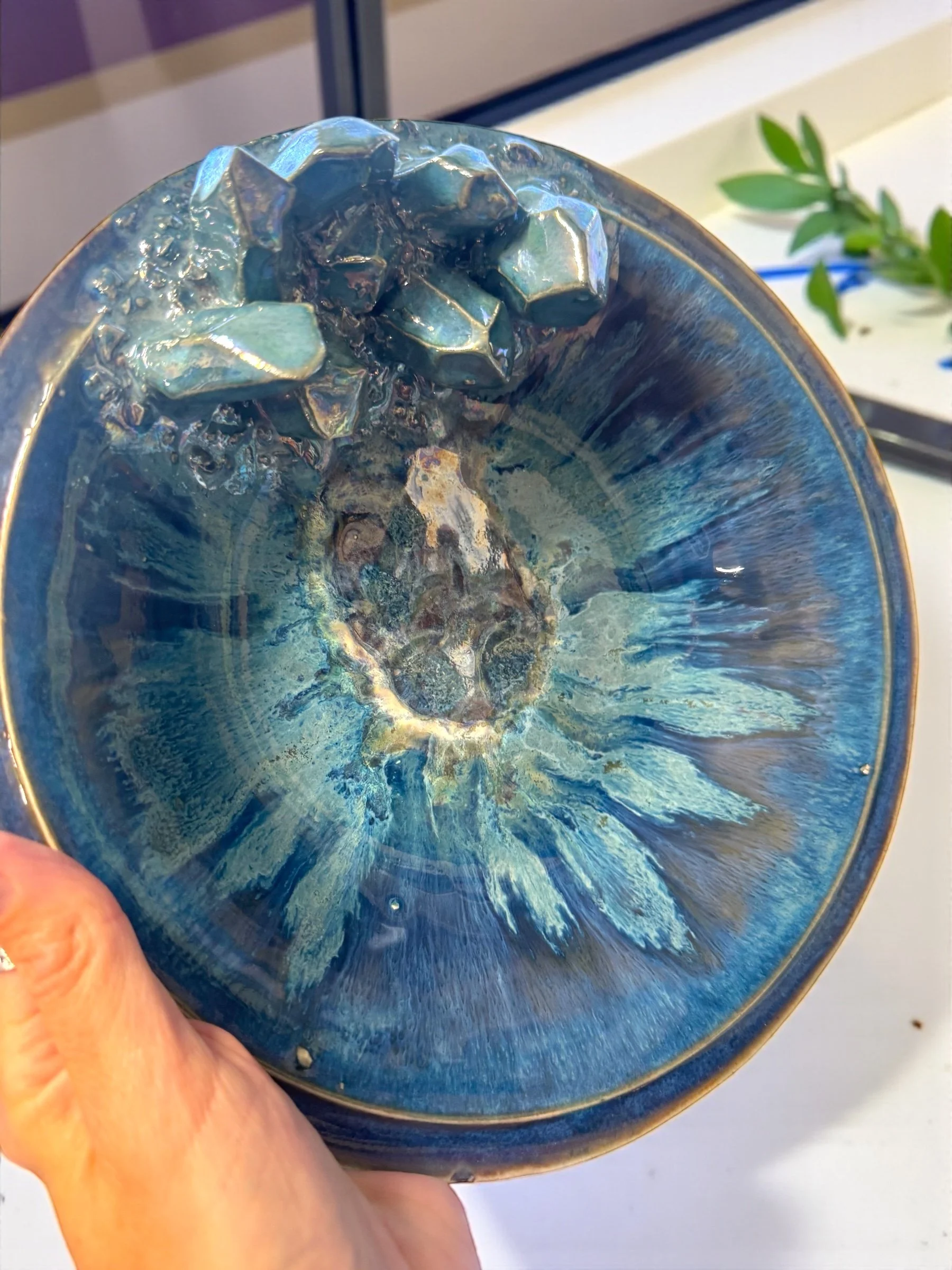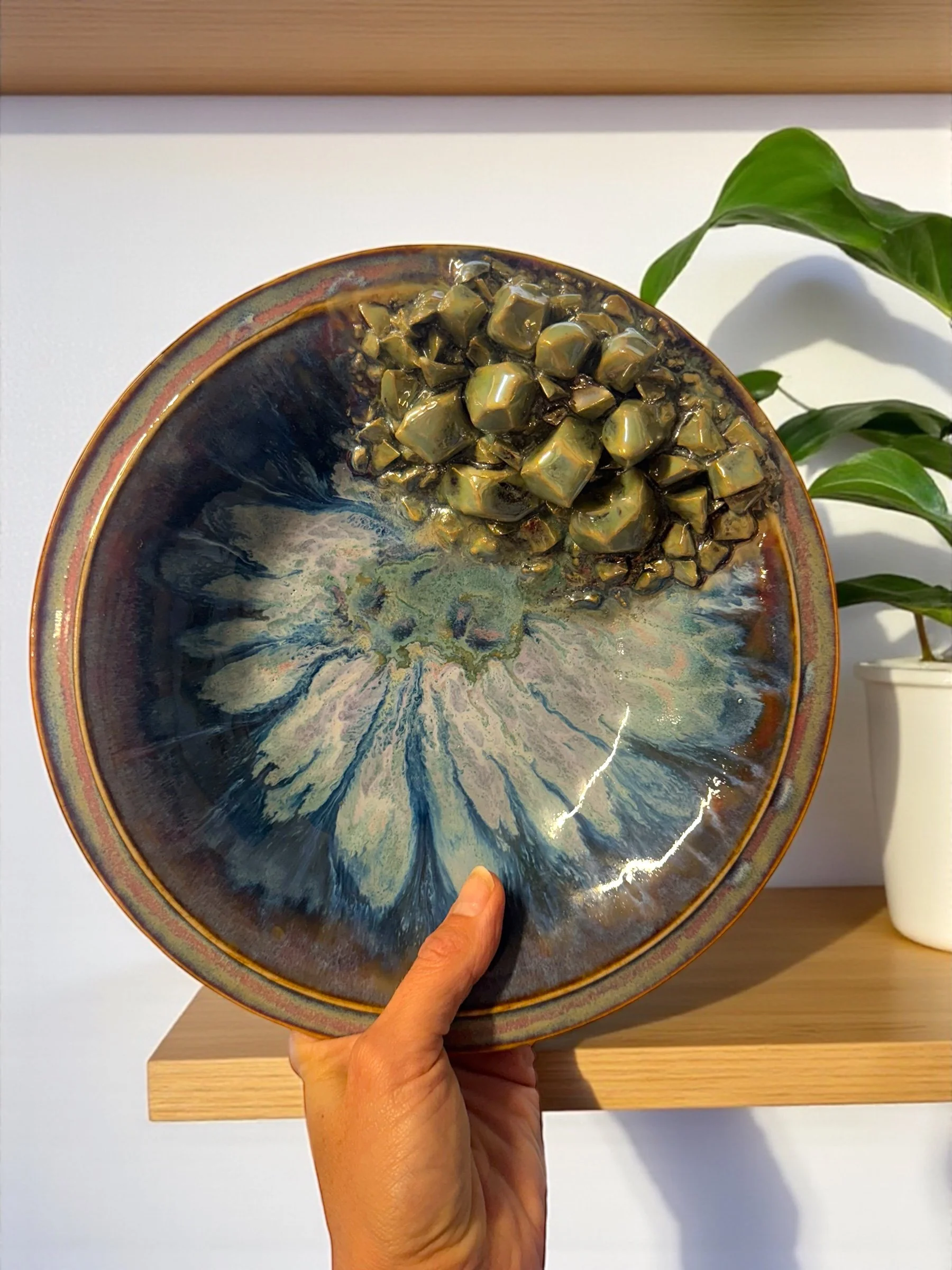 This handmade ceramic bowl embodies the beauty of transformation — a fusion of flowing glazes, layered colors, and hand-sculpted crystalline formations that seem to bloom from within. Shades of deep blue, teal, and violet radiate outward like a cosmic flower, creating a mesmerizing centerpiece that shifts beautifully in the light.