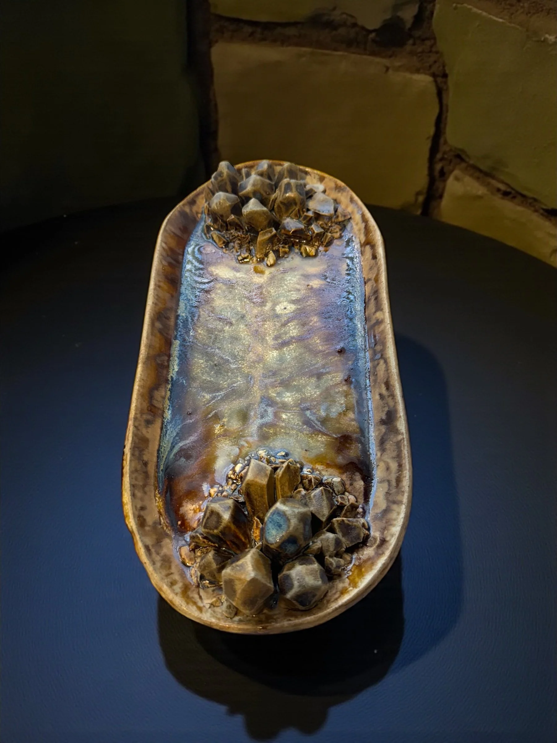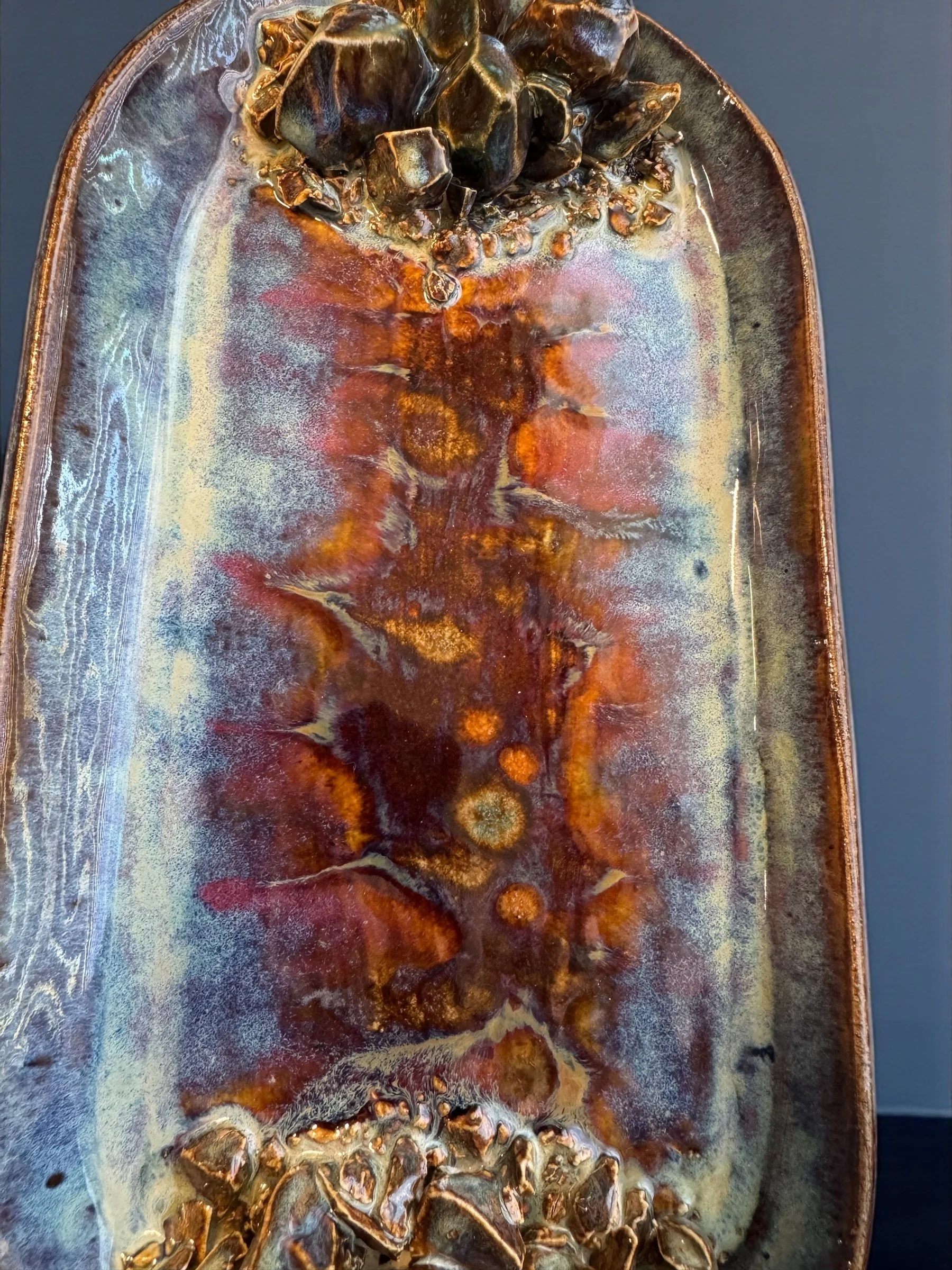 This handmade ceramic vessel embodies the energy of the earth in motion — with flowing, fiery glazes and hand-sculpted crystal clusters on both ends. The surface reveals deep hues of rust, gold, and indigo that melt into one another like volcanic glass, while the crystalline formations rise from the edges, grounding the piece in strength and structure.