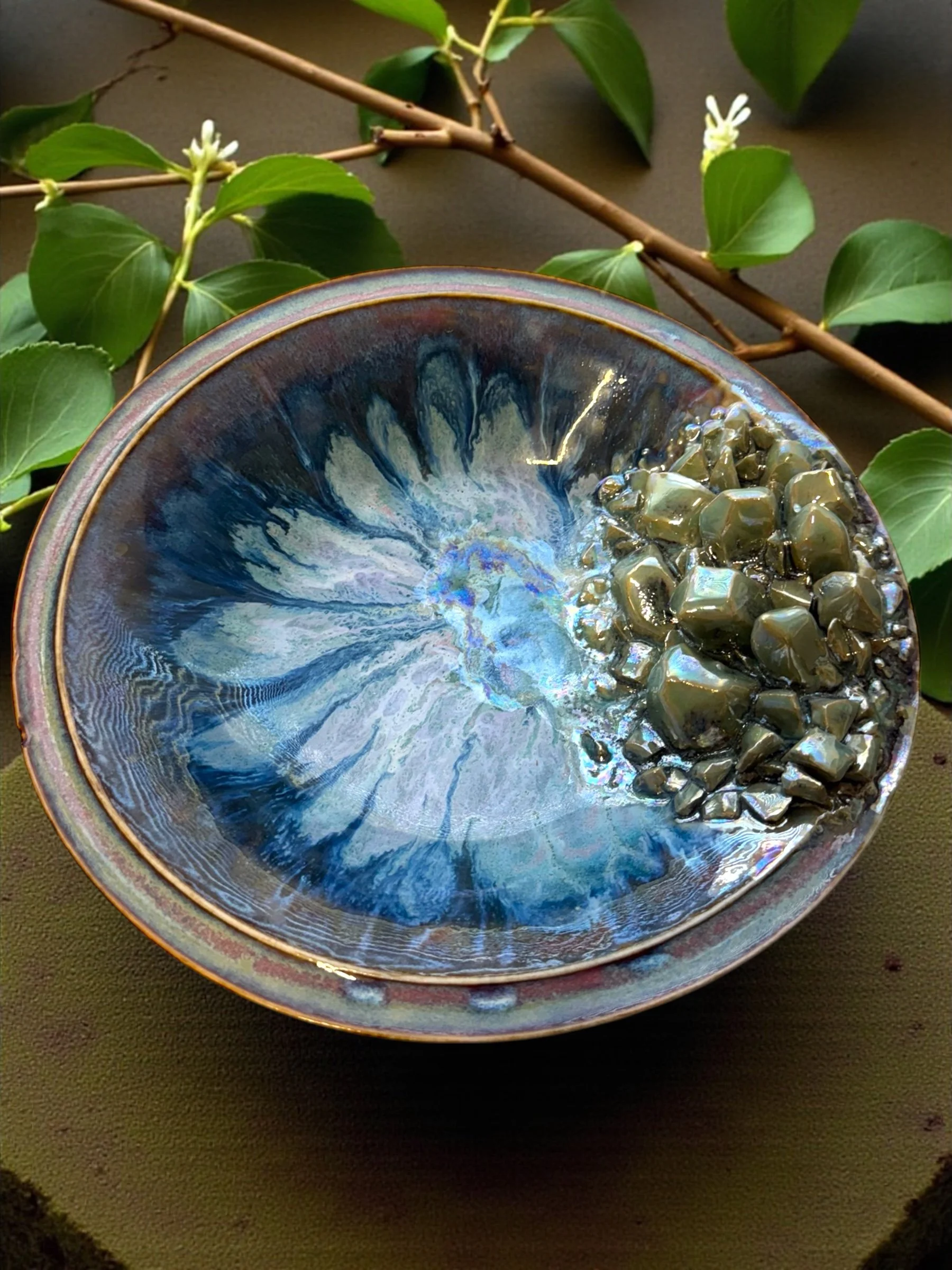 This one-of-a-kind handmade ceramic bowl captures the gentle magic of light and transformation. Layers of glaze flow in soft tones of blue, violet, and bronze, swirling like a galaxy around a cluster of hand-sculpted crystals that glisten with a luminous mother-of-pearl finish.